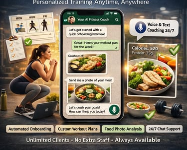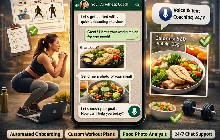 Solution: Fully automated AI fitness coach on WhatsApp. Conducts structured onboarding interviews, generates bi-weekly personalised workout plans, analyses food photos for calorie counts, and provides 24/7 coaching via text and voice.